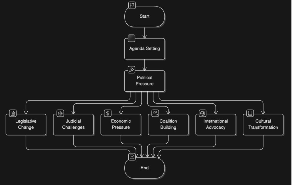 4. Judicial Challenges: Using Courts to Enforce Change: Sometimes, protest movements turn to the courts to push for change. When governments refuse to act, activists and legal groups file lawsuits, public interest litigations (PILs), or constitutional challenges to force policy shifts. Courts can play a crucial role by interpreting laws in ways that support the movement’s demands or by establishing new legal protections. This approach becomes especially important when authorities try to suppress protests or resist reforms. For instance, LGBTQ+ activists have used legal battles to win marriage equality and anti-discrimination rights in various countries. International human rights organizations and courts, like the European Court of Human Rights, have also played a key role in driving policy changes in response to widespread protests.